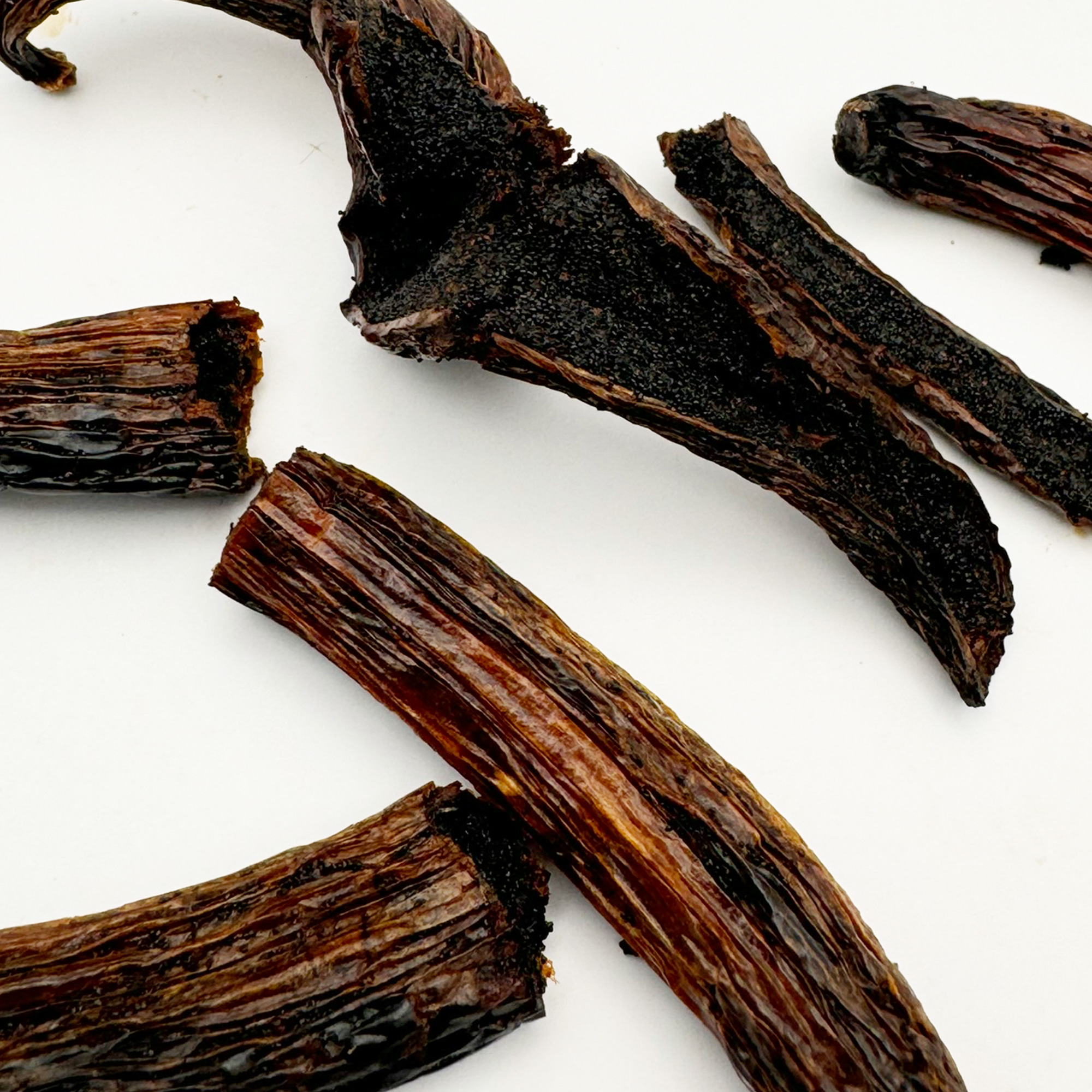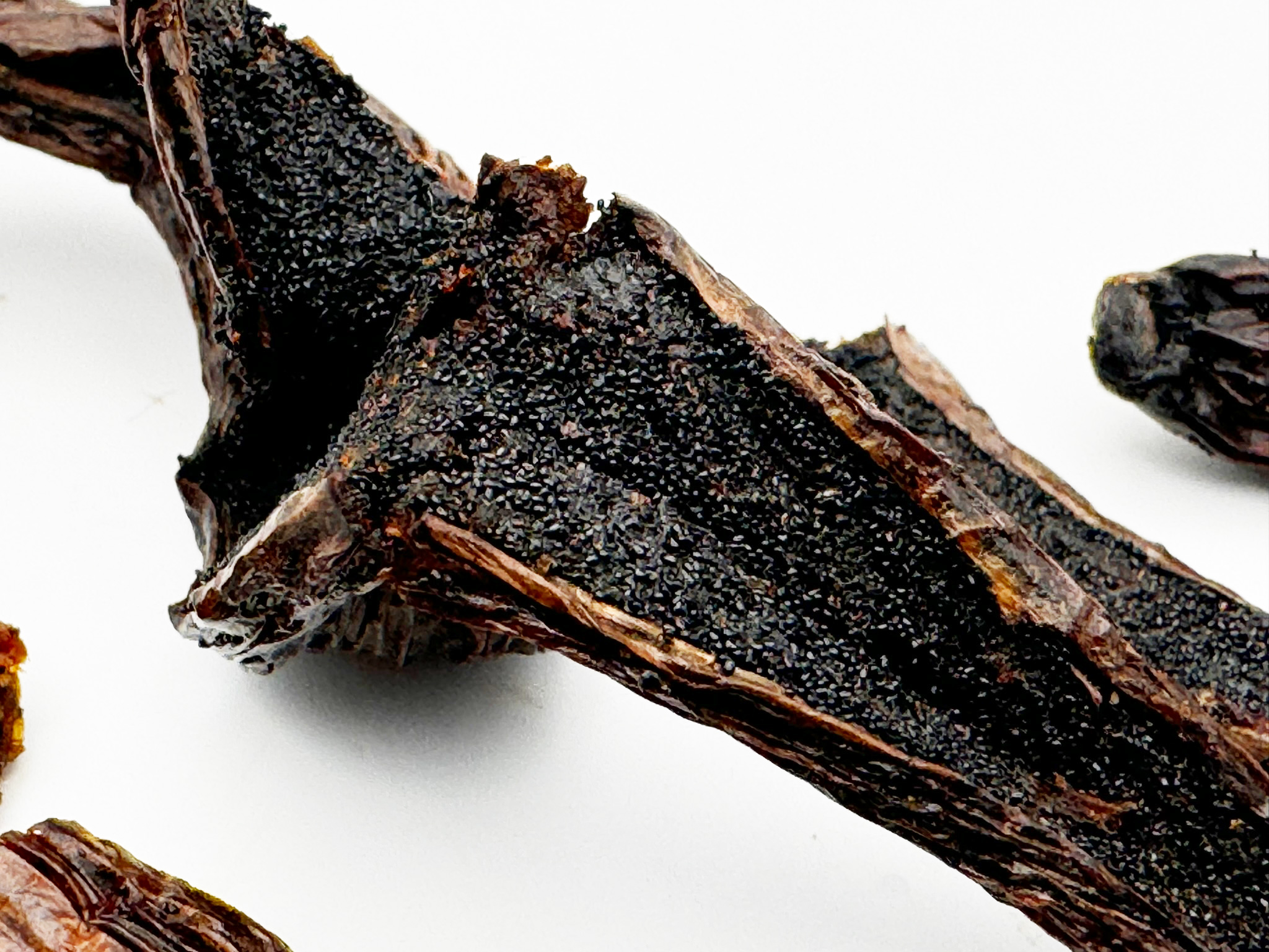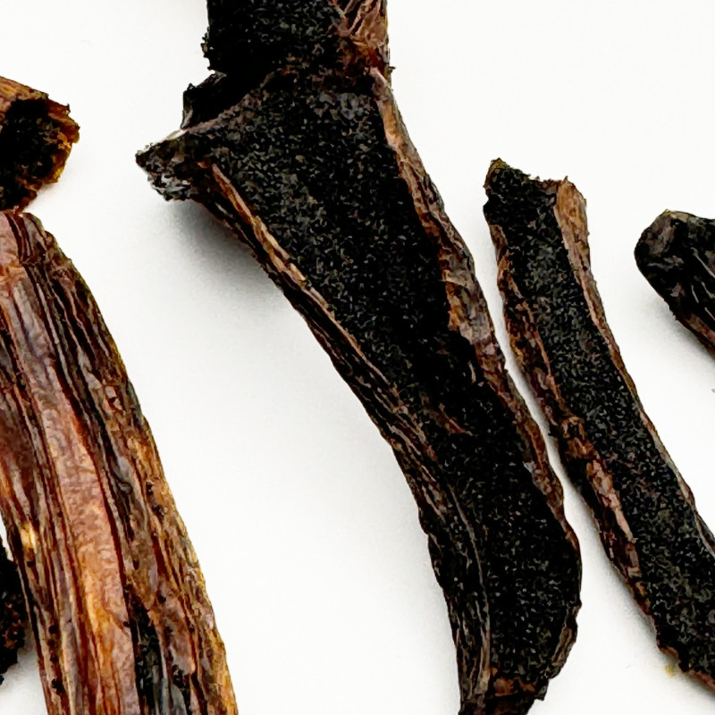 La Vanille Bahiana, une autre espèce de vanille unique et très singulière, une gousse de collection et l'une des plus petites, l'une des gousses de vanille les plus rares jamais vues dans la forêt tropicale du Cerrado Atlantique du Brésil (Mata Atlântica) sur la côte Est. Courte et charnue, avec de riches arômes de vanille et des nuances surprenantes de fromage bleu, des notes fumées, boisées et fruitées en arrière-plan. Cette espèce est également assez rare et seuls quelques agriculteurs la repèrent à l'état sauvage et la cultivent parfois sous la canopée de la forêt tropicale de l'océan Atlantique. C'est une production limitée, encore une fois, réservée aux Cheffes et aux Chefs pour des créations exceptionnelles.