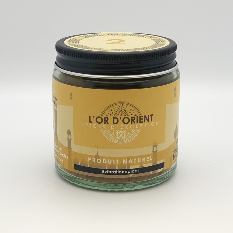 Ingrédients : Curcuma, paprika doux, fenugrec, gingembre, cannelle, fenouil, macis, cumin, piment de Cayenne, thym, menthe, poivre de Jamaïque, noix de muscade, poivre noir, clous de girofle, cardamome. (Qualité BIO)