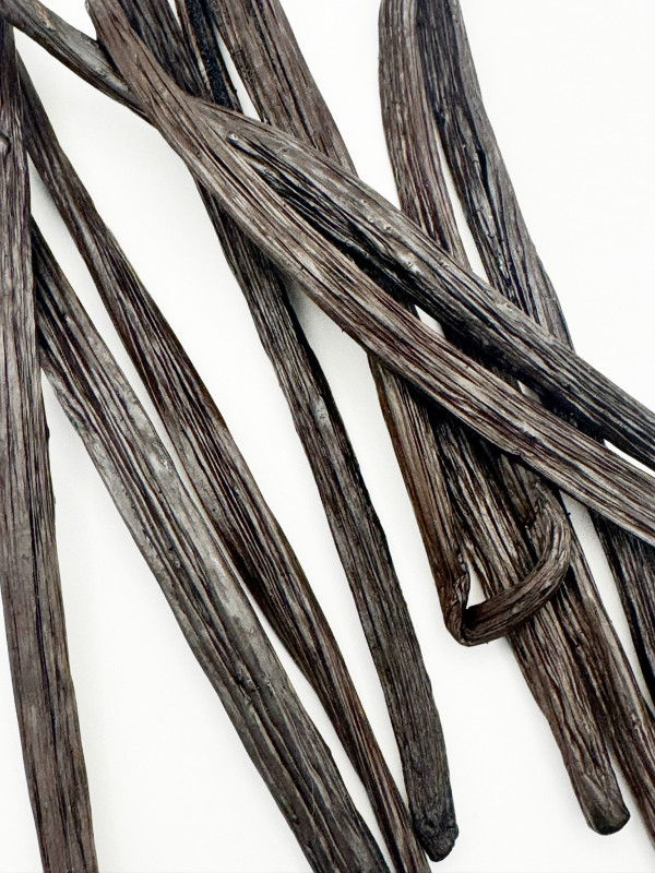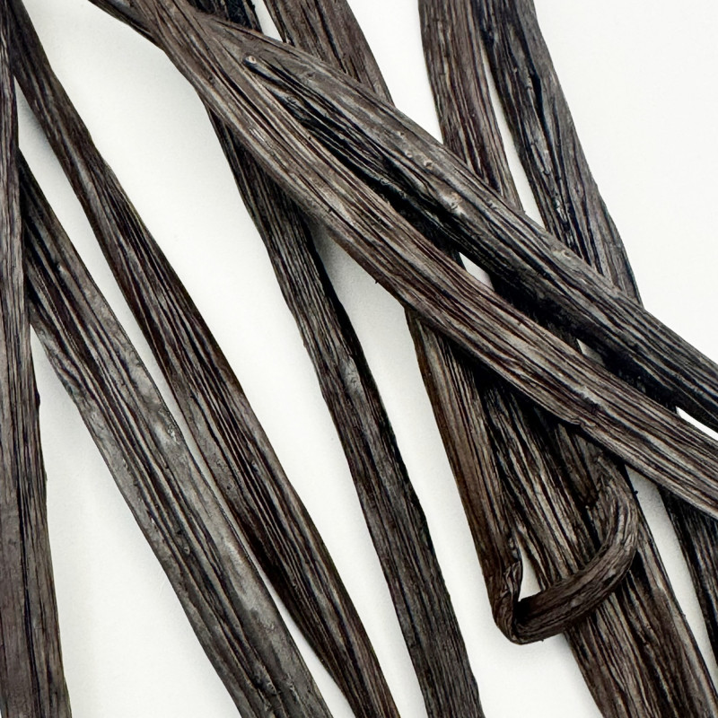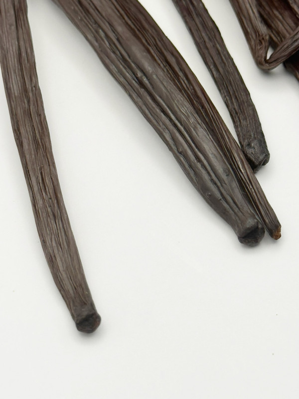 Ce qui distingue particulièrement cette vanille des autres, c’est qu’elle est proposée fraîche, c’est-à-dire non échaudée, non fendue et non séchée, ce qui préserve intactes toutes ses huiles essentielles et sa teneur en eau, et permet aux arômes de continuer à évoluer avec le temps, gagnant en rondeur et en profondeur au fil des semaines et des mois. Les gousses, longues d’environ dix-neuf centimètres et pesant en moyenne cinq grammes, présentent un taux d’humidité exceptionnel, proche de quarante pour cent, et un taux de vanilline d’environ deux virgule deux pour cent, garantissant une intensité gustative et olfactive remarquable. Leur texture souple et légèrement huileuse, leur brillance naturelle et leur parfum puissant en font un ingrédient d’exception aussi bien pour les artisans que pour les passionnés de gastronomie recherchant un produit singulier.