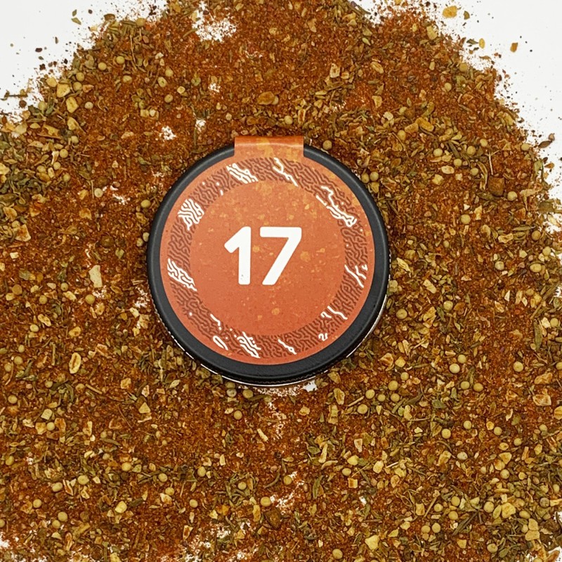 Ingrédients : paprika fumé, fibres de cacao grillé, moutarde*, oignon, sucre panela, poivre noir, ail fumé, sel du désert Kalahari, thym, origan, piment d’Espelette. (Qualité BIO)