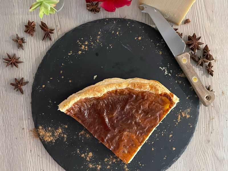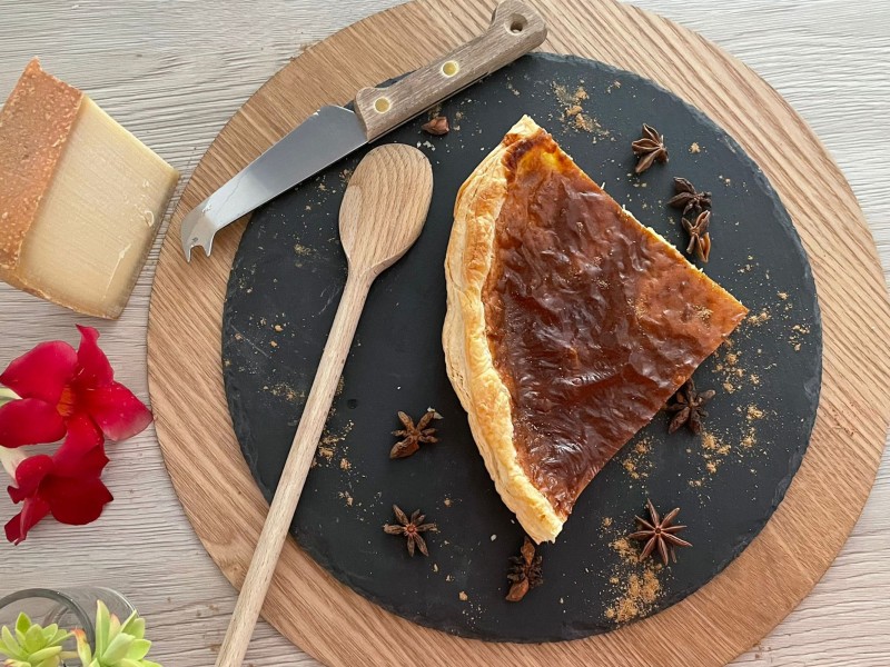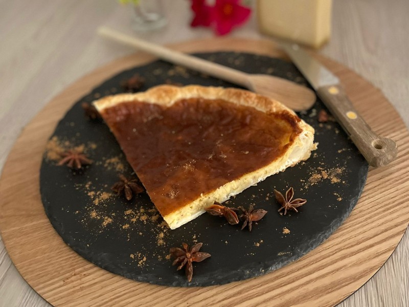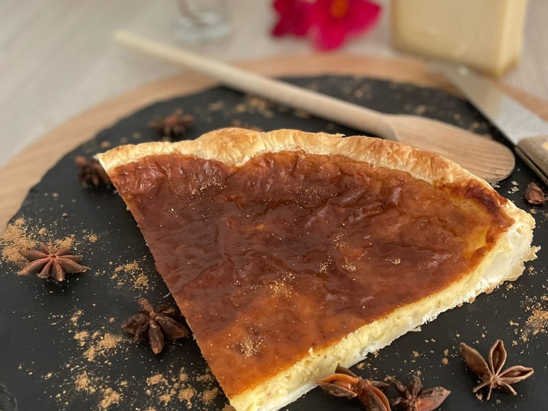 - Cuire au four à 220 degrés, jusqu’à ce que la tarte devienne légèrement dorée.