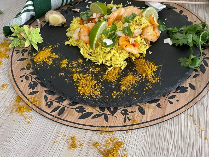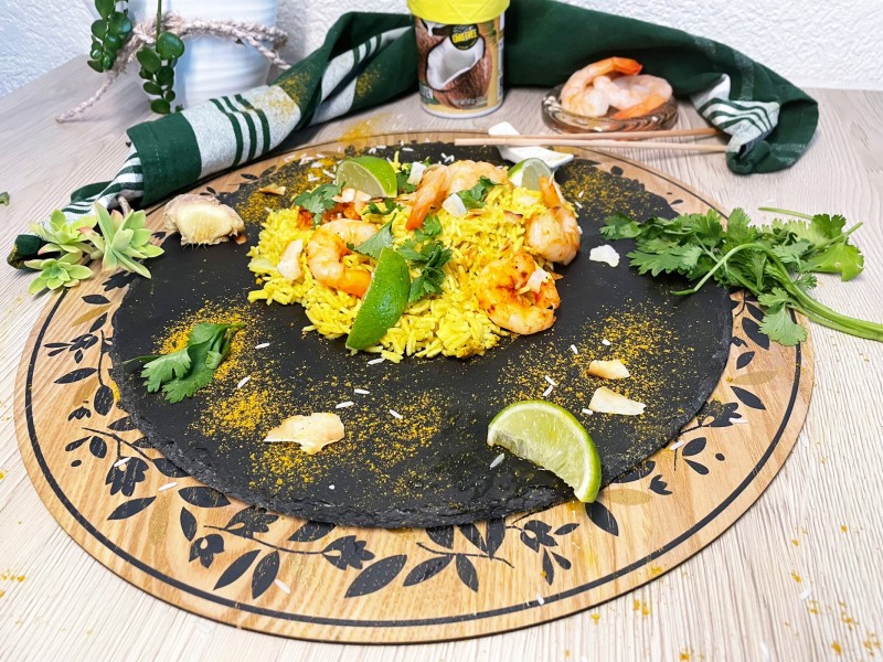 Riz au Yellow Vibration, crevettes et noix de coco