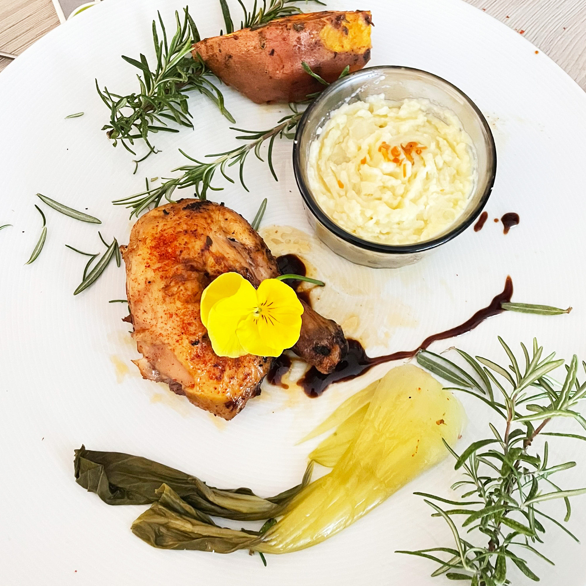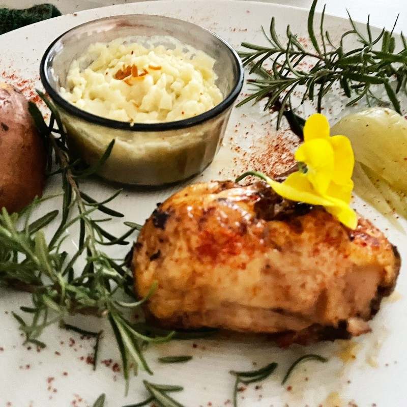 - badigeonner le poulet avec le paprika et les autres ingrédients. Mettre le romarin, l’échalotte, le citron coupés à l’intérieur du poulet
