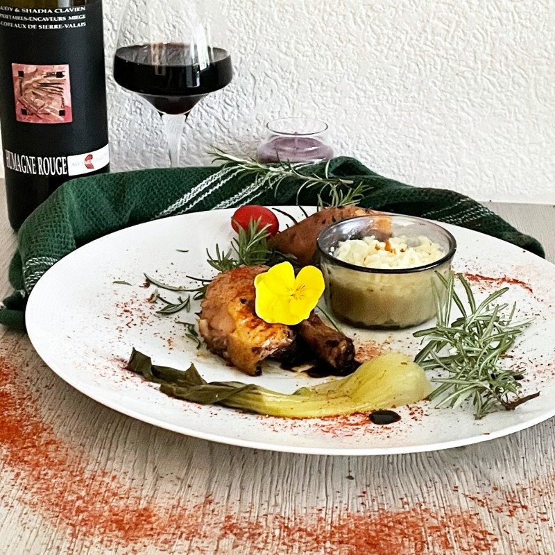 - à mi-cuisson, verser le vin avec le miel dilué sur le poulet et terminer la cuisson