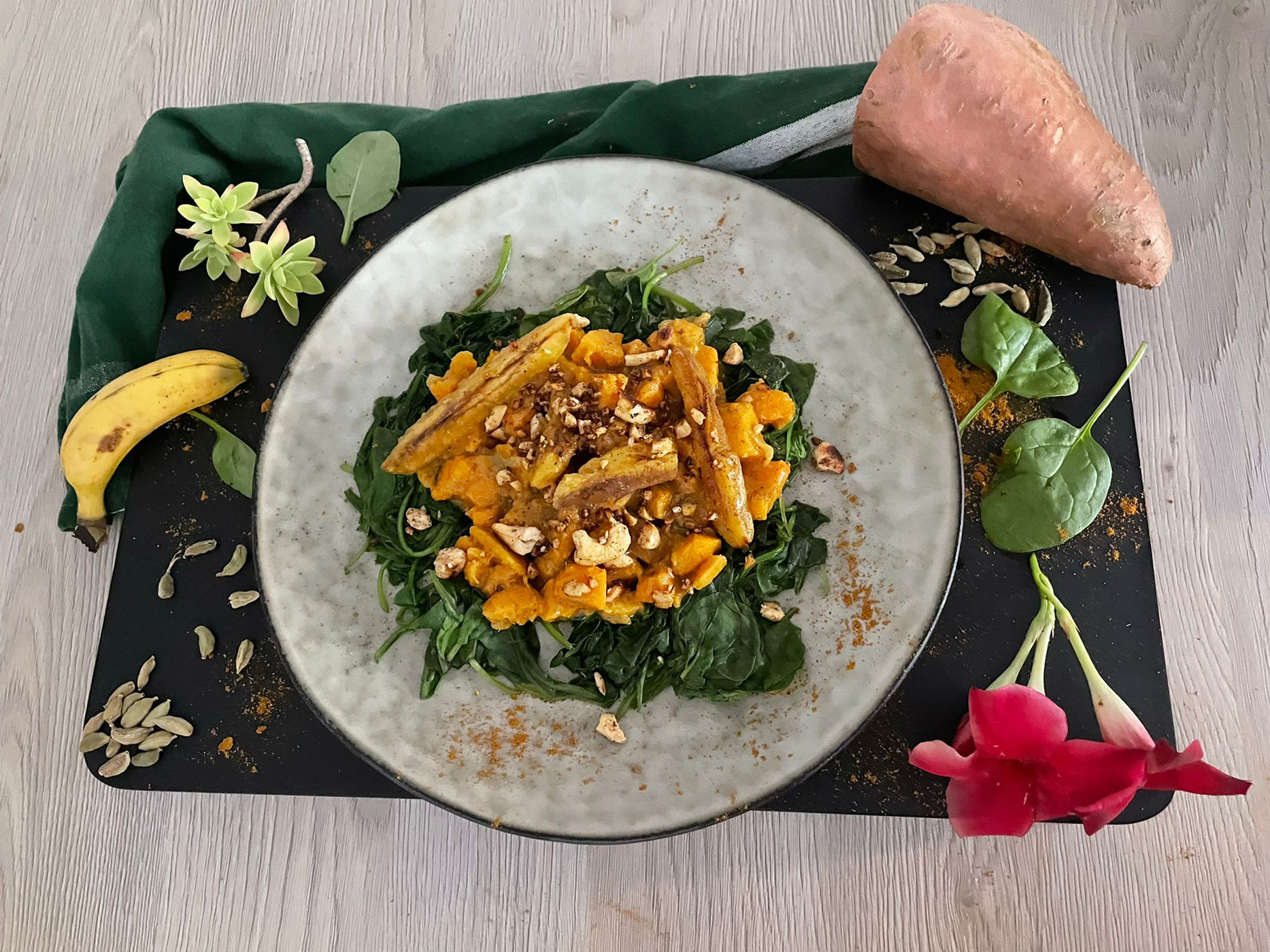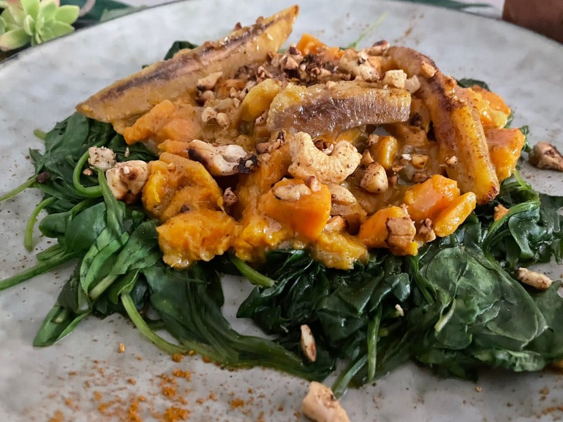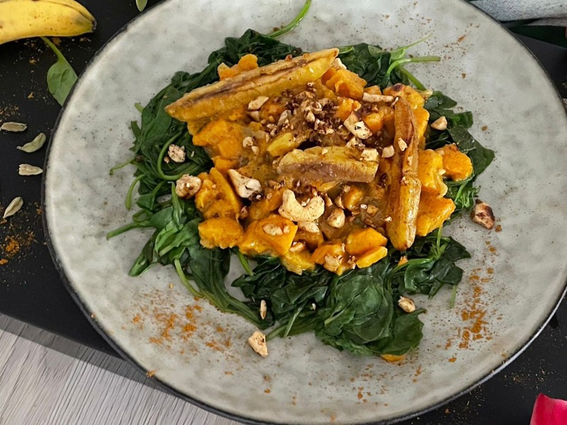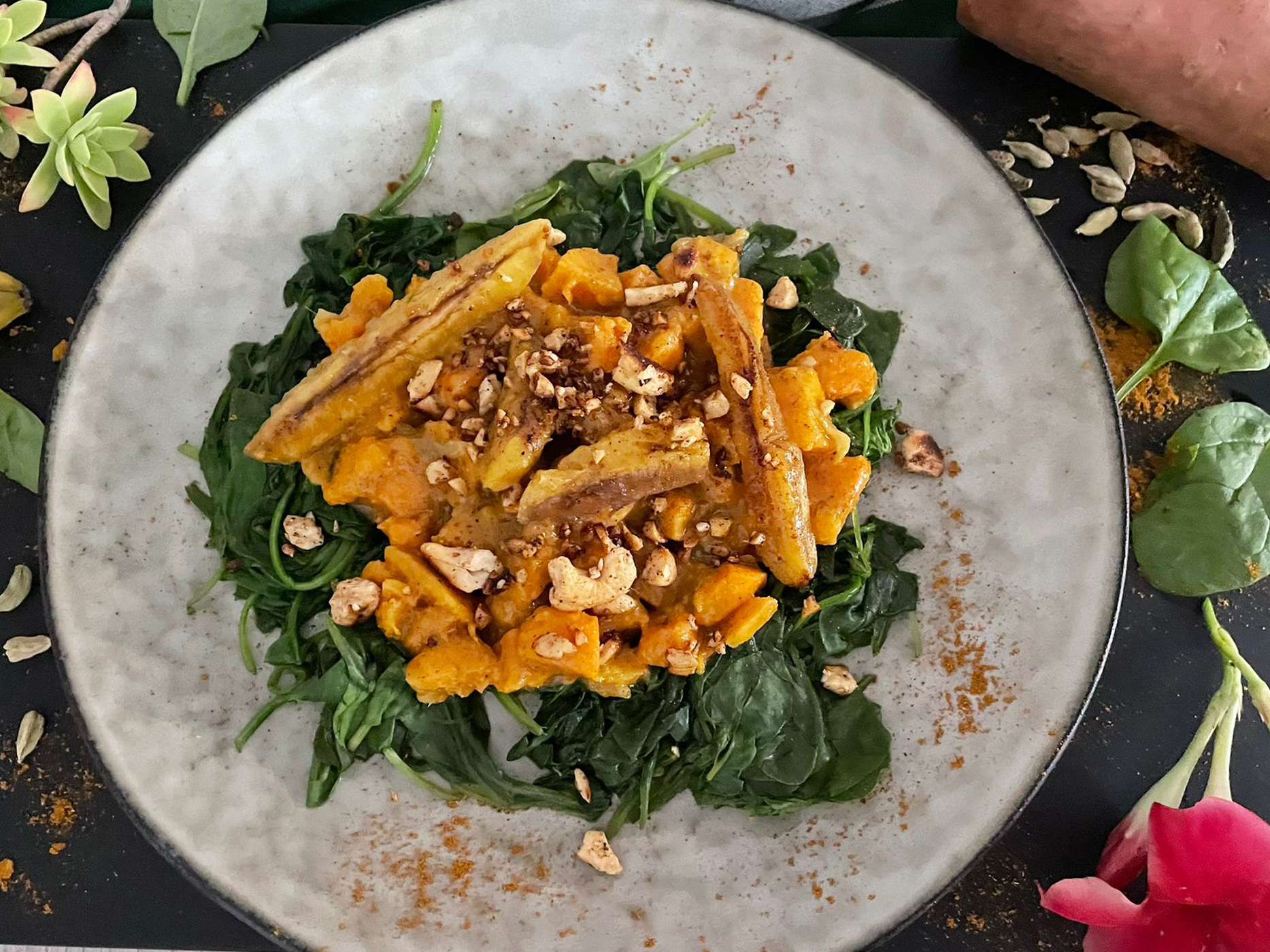 - Répartir les bananes, les noix de cajou grillées et quelques feuilles de coriandre sur le plat.